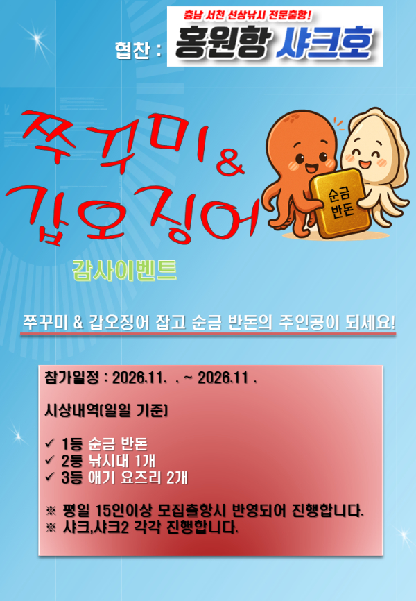 홍원항 샤크호 조선장입니다 오늘도 쭈꾸미 갑오징어  잡으시냐  고생 하셨습니다  이번주평일날에 이벤트 를 진행 합니다 ,,,